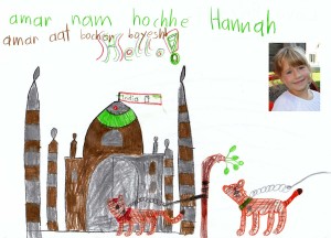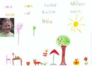 She is from Austria and her name is Karin. She and my sister (Priyanka aka Rifle100) were playing a forum game when Karin asked her to translate two lines of English in our mother tongue, Bengali. Priya did that… and…. voila! Karin sent us pictures drawn and colored by children of her school with those translated words! It was such a cute surprise that we both went like crazy with happiness! That is the best gift we have ever received, that also in December when Christmas is nearing! Karin has also beautifully attached the images of those cute little angels. I couldn’t contain my joy and were dying to share it with everyone. And on the occasion of our year long presence in our niche of RPGs, here are the wonderful gifts. Click on them to get the full view, I have arranged them alphabetically by their names so that none of them are disappointed